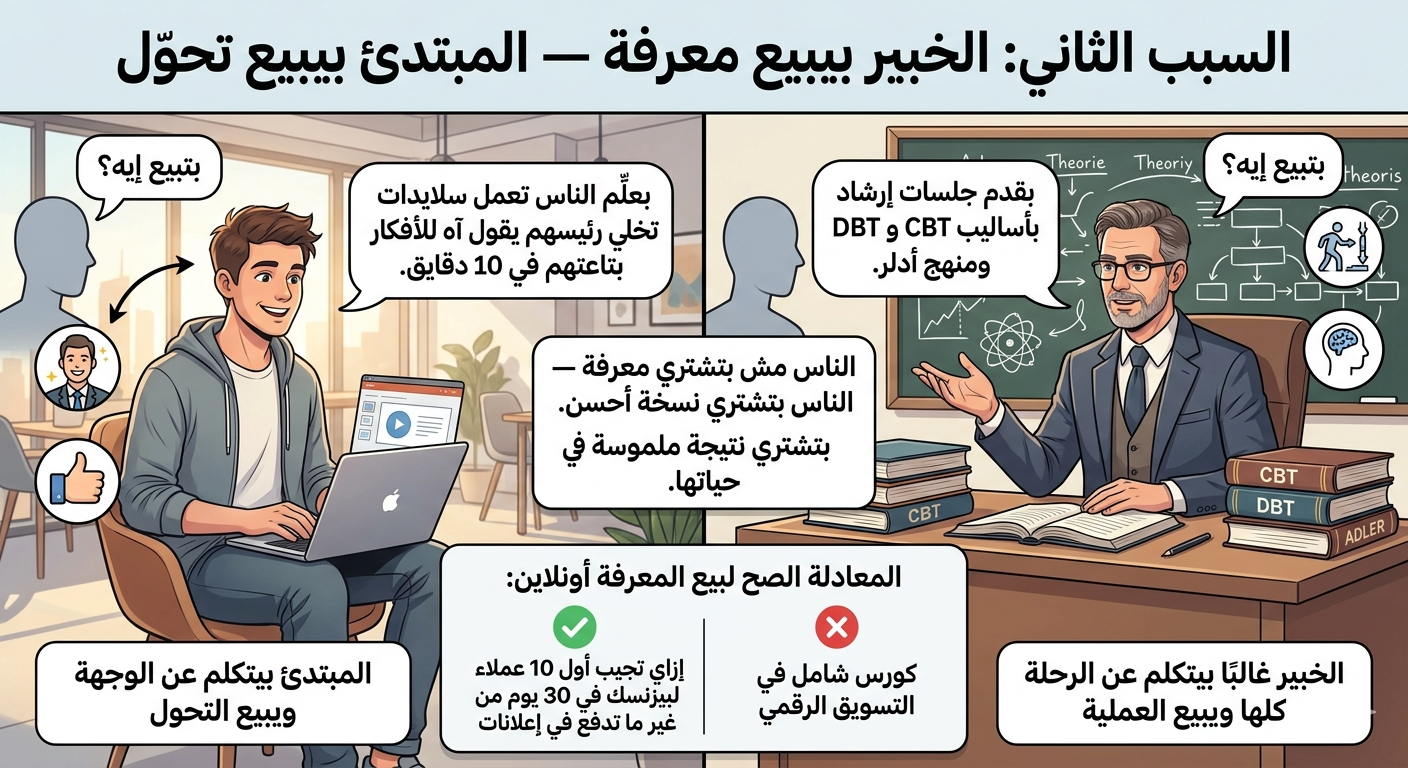 السبب الثاني: الخبير بيبيع معرفة — المبتدئ بيبيع تحول